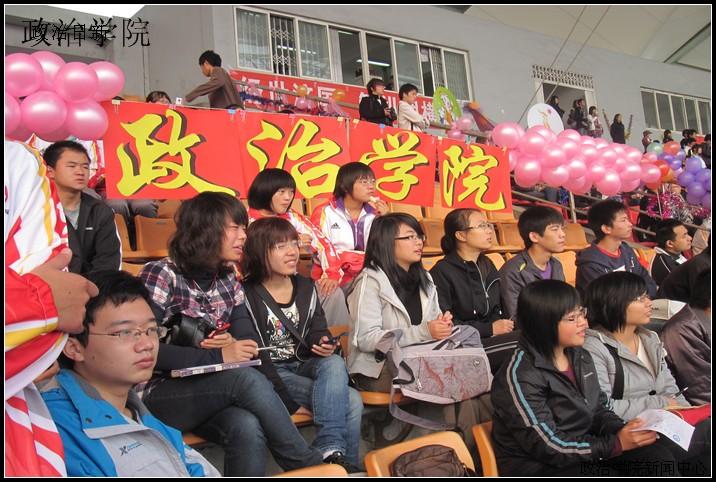 上场的机会是有限的,而观看的乐趣却是无穷的。观众席上,政治学院的观众倾入了满腔热情,与其他学院的拉拉队进行激烈的“交锋”,他们务求让每一声呐喊都融入激情,使每一声口号都响彻云霄,从而达到为赛场上的运动员呐喊助威的效果。大本营中,政治学院团委和学生会分工明确,相互合作,他们准时为运动员检录,及时采集广播稿,忙得不亦乐乎。