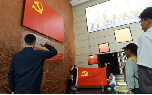 在展馆出口,墙上的党旗与入党誓词,格外引人注目。面对鲜艳的党旗,党员同志再一次重温入党誓词,表明不忘初心、牢记使命,踔厉奋发、勇毅前行的决心和勇气。最后,全体同志在纪念馆前合影留念。