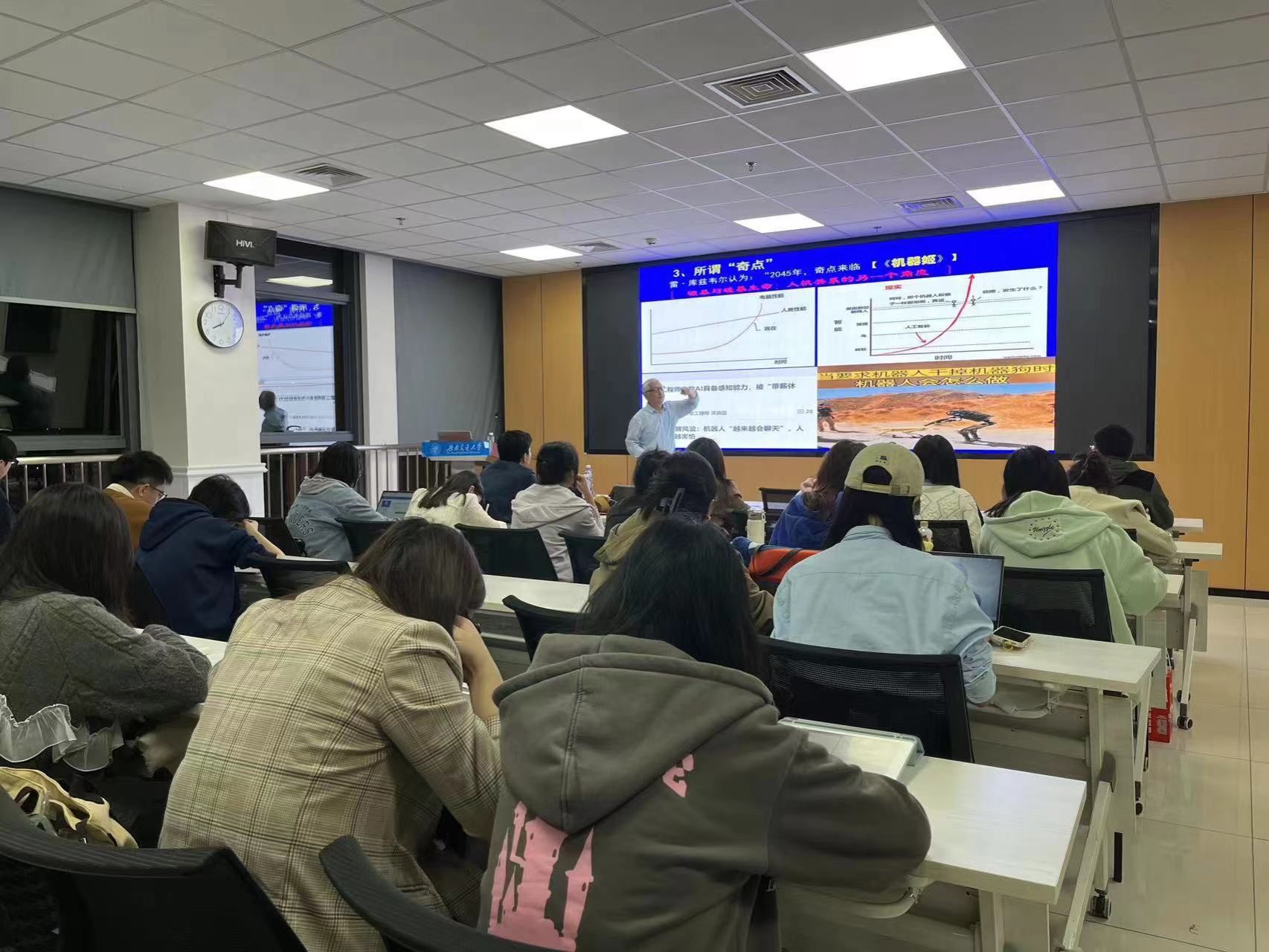 董春雨教授以“从机器认识的不透明性看AI的本质及其限度”为题,就当前人工智能研究中的核心理论问题,即人工智能的“理解力”问题展开讨论,具体阐释了机器智能的优势,以及包括“认知透明性与认识 (全过程) 透明性的区别与联系”“透明性概念”等在内的九个方面的具体问题。董春雨教授的整个演讲妙语连珠,娓娓道来,将同学们的思绪带入到了对机器智能的哲学思考之中。