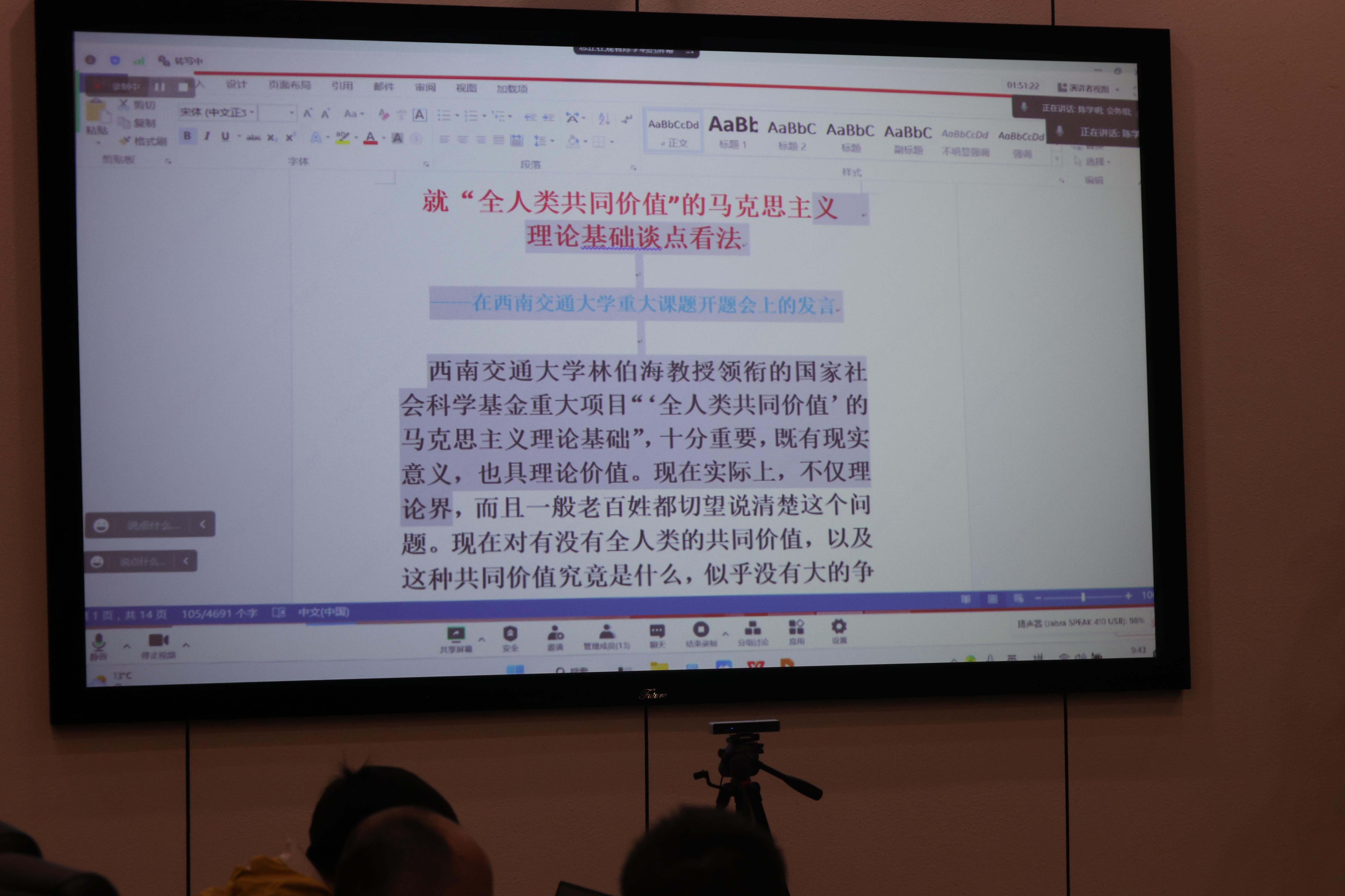 项久雨教授从“普世价值”和全人类共同价值的区别出发,强调全人类共同价值研究的重要性,以及研究所需的锐利性,认为全人类共同价值绕不开人类命运共同体和“两个大局”。他肯定了课题结构的自恰性和建构性和子课题分工的合理性,同时从题目的再思考、子课题的再优化、理论基础的再挖掘,以及实际操作的注意点等方面给予了富有启示性的意见。
